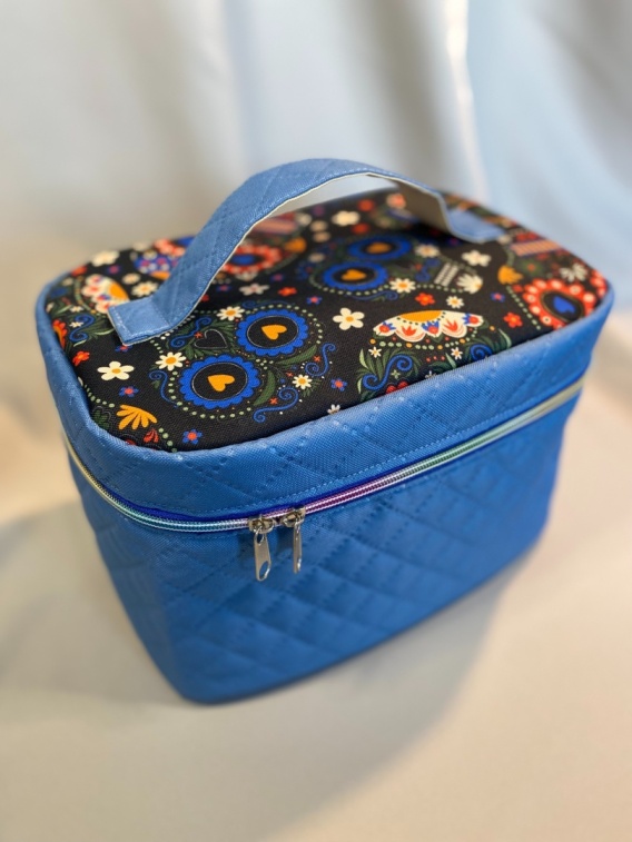 Jej scianki i dno s膮 wzmocnione pikowaniem i usztywnieniem, tak aby kosmetyki by艂y bezpieczne a kuferek trzyma艂 sw贸j kszta艂t. Klapka r贸wnie偶 zosta艂a usztywniona, dodatkowo posiada uchwyt u艂atwiaj膮cy przenoszenie kosmetyczki