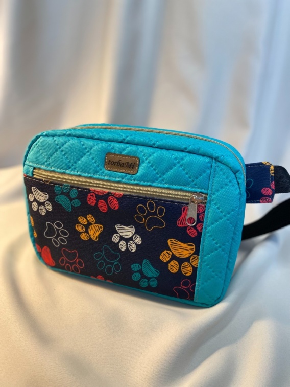 Oferuję wykonanie tej saszetki na zamówienie, a więc możesz wybrać materiały które najbardziej do Ciebie przemawiają 😌 zdjęcia przedstawiają odszycie z tkanin wodoodpornych: w psie łapki oraz pikowanej w kolorze turkusu, z pasem z plastikową klamrą